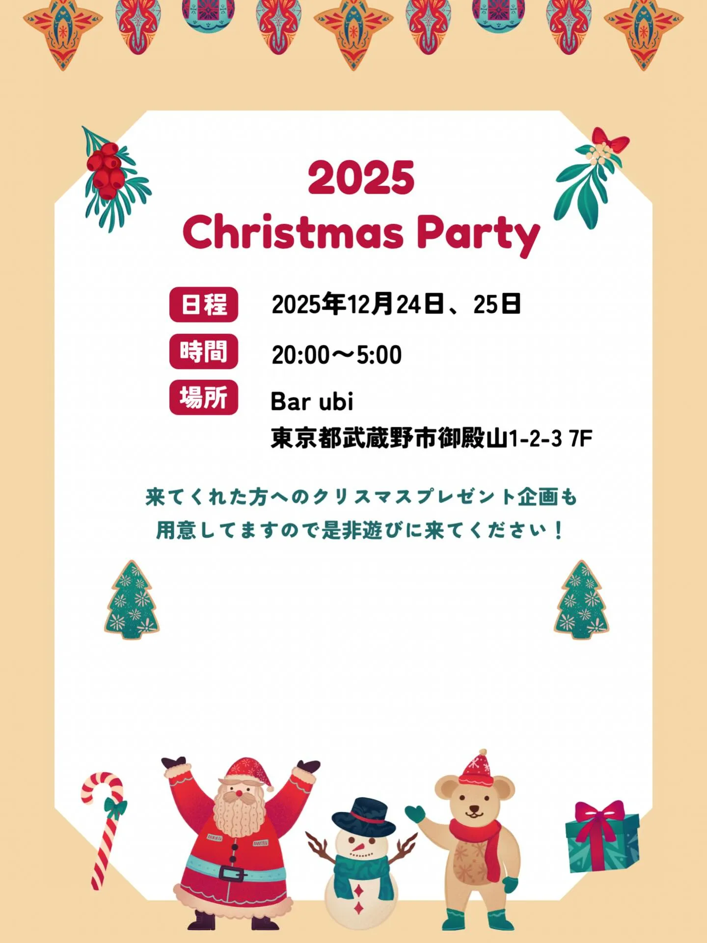 12月24日、25日Bar ubiでクリスマスイベントやりま... 2025/12/18 12月24日、25日Bar ubiでクリスマスイベントやります! スタッフ一同サンタになってお待ちしております🎅🏻 来てくれた方に素敵なプレゼントがあるかもね😁 みんなでクリスマス楽しみましょう🍻